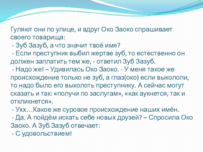 - Мы когда вдвоём гуляли по аллее, Око Заоко спросила меня, откуда произошло моё имя. Теперь я хочу вас спросить, откуда? – Они хором отвечают: