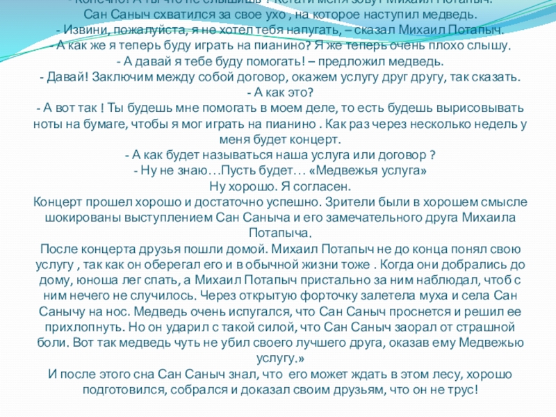 После концерта друзья пошли домой. Михаил Потапыч не до конца понял свою услугу , так как он оберегал его и в обычной жизни тоже . Когда они добрались до дому, юноша лег спать, а Михаил Потапыч пристально за ним наблюдал, чтоб с ним нечего не случилось. Через открытую форточку залетела муха и села Сан Санычу на нос. Медведь очень испугался, что Сан Саныч проснется и решил ее прихлопнуть. Но он ударил с такой силой, что Сан Саныч заорал от страшной боли. Вот так медведь чуть не убил своего лучшего друга, оказав ему Медвежью услугу.»