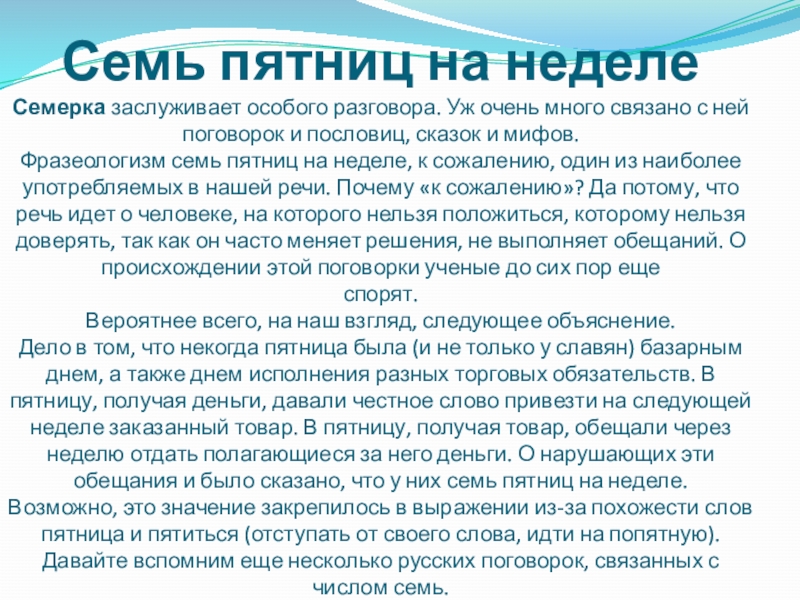 Фразеологизм семь пятниц на неделе, к сожалению, один из наиболее употребляемых в нашей речи. Почему «к сожалению»? Да потому, что речь идет о человеке, на которого нельзя положиться, которому нельзя доверять, так как он часто меняет решения, не выполняет обещаний. О происхождении этой поговорки ученые до сих пор еще