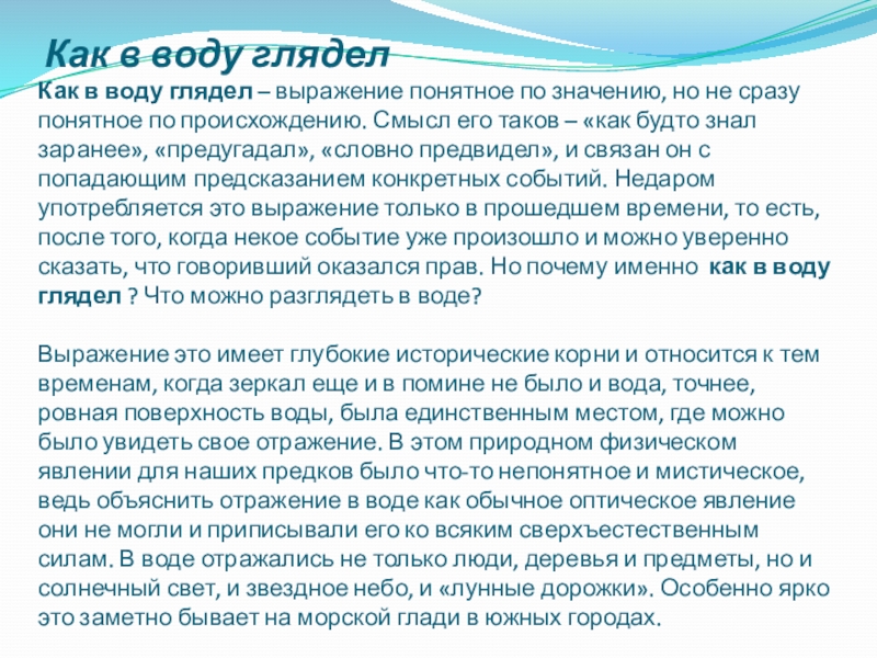 по значению, но не сразу понятное по происхождению. Смысл его таков – «как будто знал заранее», «предугадал», «словно предвидел», и связан он с попадающим предсказанием конкретных событий. Недаром употребляется это выражение только в прошедшем времени, то есть, после того, когда некое событие уже произошло и можно уверенно сказать, что говоривший оказался прав. Но почему именно как в воду глядел ? Что можно разглядеть в воде?