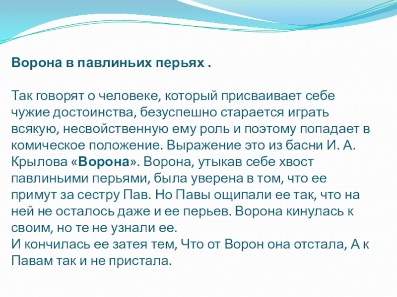 чужие достоинства, безуспешно старается играть всякую, несвойственную ему роль и поэтому попадает в комическое положение. Выражение это из басни И. А. Крылова «Ворона». Ворона, утыкав себе хвост павлиньими перьями, была уверена в том, что ее примут за сестру Пав. Но Павы ощипали ее так, что на ней не осталось даже и ее перьев. Ворона кинулась к своим, но те не узнали ее.