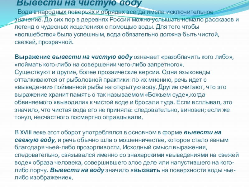 В XVIII веке этот оборот употреблялся в основном в форме вывести на свежую воду, и речь обычно шла о мошенничестве, которое стало явным благодаря чьей-либо прозорливости. Исходный смысл выражения, следовательно, связывался именно со знахарскими «выведениями на свежей воде» образа человека, совершившего злое деле или напустившего на кого-либо порчу. Вывести на воду значило «вызвать на поверхности воды чье-либо изображение».