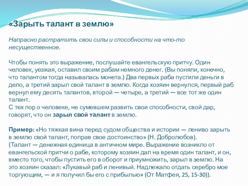(Талант — денежная единица в античном мире. Выражение возникло от евангельской притчи о рабе, которому хозяин дал на время один талант, и он, вместо того, чтобы пустить его в оборот и приумножить, зарыл в землю. На это хозяин сказал: «Лукавый раб и ленивый. Надлежало отдать серебро мое торгующим, — и я получил бы его с прибылью» (От Матфея, 25, 15-30)).