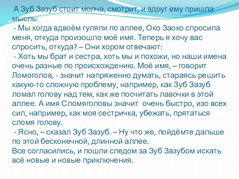 - Хоть мы брат и сестра, хоть мы и похожи, но наши имена очень разные по происхождению. Моё имя, – говорит Ломоголов, - значит напряженно думать, стараясь решить какую-то сложную проблему, например, как Зуб Зазуб ломал голову над тем, как же посчитать лавочки в этой аллее. А имя Сломяголовы значит очень быстро, изо всех сил, например, как моя сестричка, убежать, прятаться сломя голову.