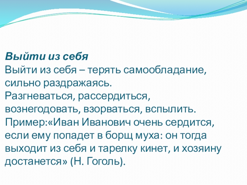 Пример:«Иван Иванович очень сердится, если ему попадет в борщ муха: он тогда выходит из себя и тарелку кинет, и хозяину достанется» (Н. Гоголь).