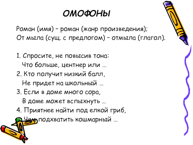 ОМОФОНЫРоман (имя) – роман (жанр произведения);От мыла (сущ. с предлогом) – отмыла (глагол).1. Спросите, не повысив тона: