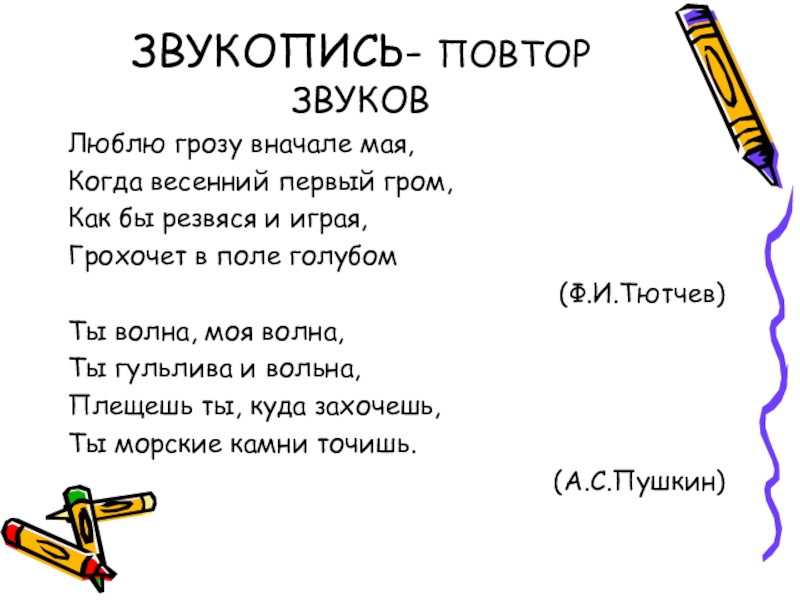 ЗВУКОПИСЬ- ПОВТОР ЗВУКОВЛюблю грозу вначале мая, Когда весенний первый гром,Как бы резвяся и играя, Грохочет в поле