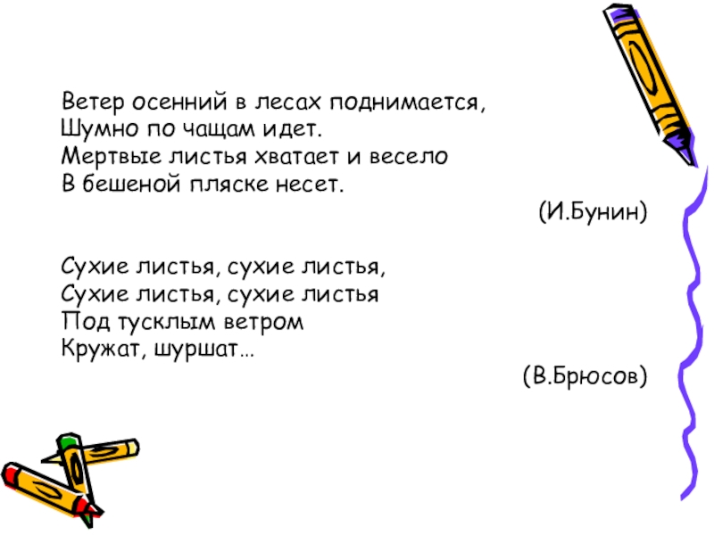 Ветер осенний в лесах поднимается,Шумно по чащам идет.Мертвые листья хватает и веселоВ бешеной пляске несет.(И.Бунин)Сухие листья, сухие
