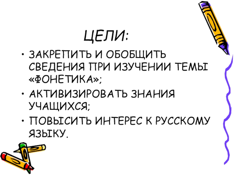 ЦЕЛИ:ЗАКРЕПИТЬ И ОБОБЩИТЬ СВЕДЕНИЯ ПРИ ИЗУЧЕНИИ ТЕМЫ «ФОНЕТИКА»;АКТИВИЗИРОВАТЬ ЗНАНИЯ УЧАЩИХСЯ;ПОВЫСИТЬ ИНТЕРЕС К РУССКОМУ ЯЗЫКУ.