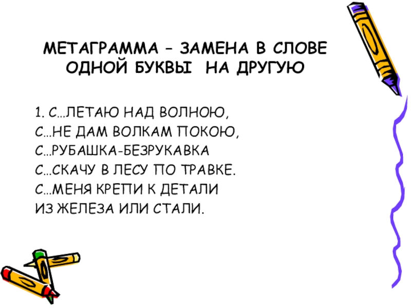 МЕТАГРАММА – ЗАМЕНА В СЛОВЕ ОДНОЙ БУКВЫ НА ДРУГУЮ1. С…ЛЕТАЮ НАД ВОЛНОЮ,С…НЕ ДАМ ВОЛКАМ ПОКОЮ,С…РУБАШКА-БЕЗРУКАВКАС…СКАЧУ В ЛЕСУ