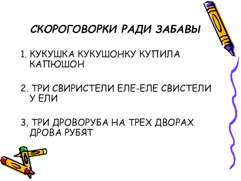 СКОРОГОВОРКИ РАДИ ЗАБАВЫ1. КУКУШКА КУКУШОНКУ КУПИЛА КАПЮШОН2. ТРИ СВИРИСТЕЛИ ЕЛЕ-ЕЛЕ СВИСТЕЛИ У ЕЛИ3. ТРИ ДРОВОРУБА НА ТРЕХ