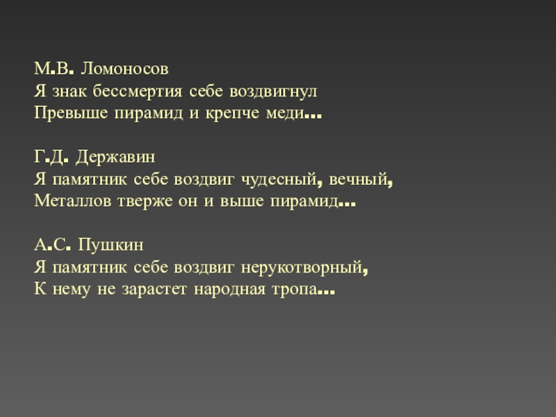 М.В. Ломоносов Я знак бессмертия себе воздвигнул Превыше пирамид и крепче меди…  Г.Д. Державин Я памятник