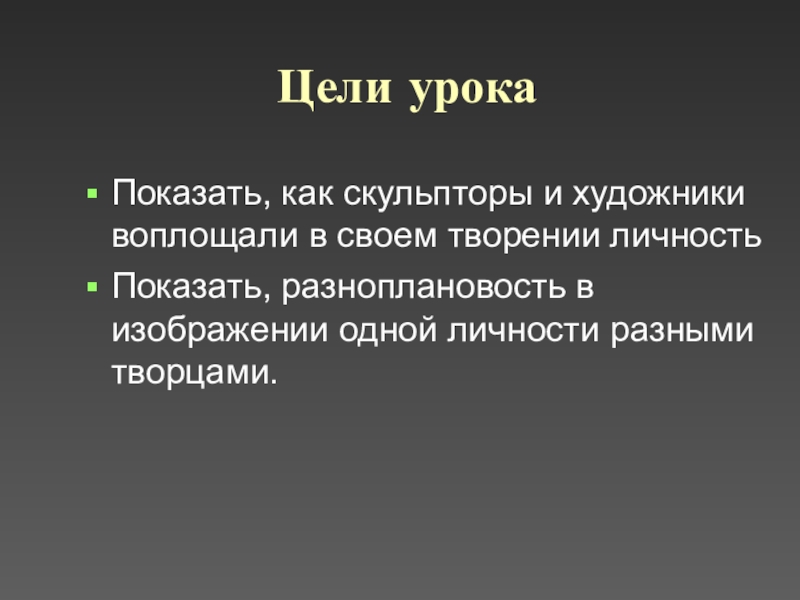 Цели урокаПоказать, как скульпторы и художники воплощали в своем творении личностьПоказать, разноплановость в изображении одной личности разными