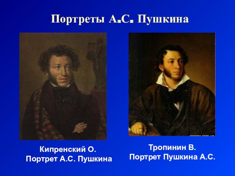 Портреты А.С. ПушкинаКипренский О. Портрет А.С. ПушкинаТропинин В.Портрет Пушкина А.С.