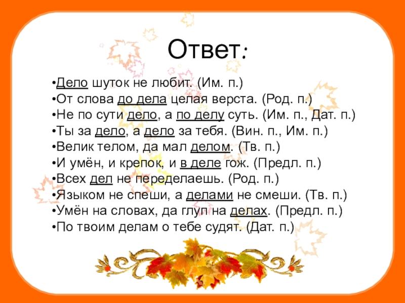 Слайд 73.Определить падеж у выделенных слов в пословицах.