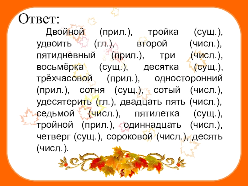 1. Определить часть речи у следующих слов: Двойной, тройка, удвоить,