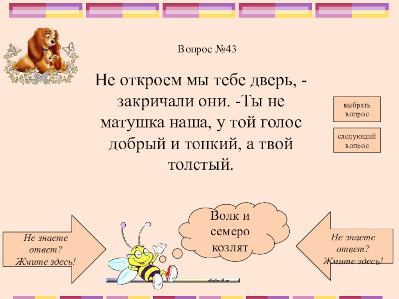 мы тебе дверь, - закричали они. -Ты не матушка наша, у той голос добрый и тонкий, а твой толстый.