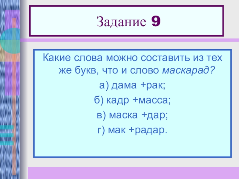 Задание 9Какие слова можно составить из тех же букв, что и слово маскарад?а) дама +рак;б) кадр +масса;в)