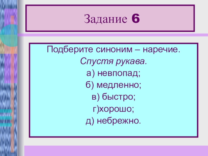 Задание 6Подберите синоним – наречие.Спустя рукава.а) невпопад;б) медленно;в) быстро;г)хорошо;д) небрежно.