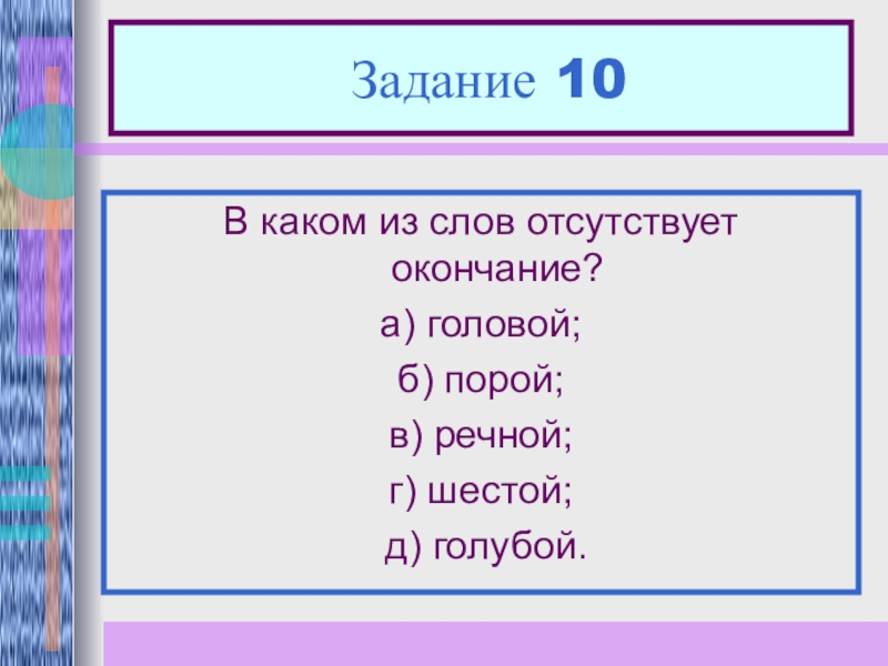 Задание 10В каком из слов отсутствует окончание?а) головой;б) порой;в) речной;г) шестой; д) голубой.
