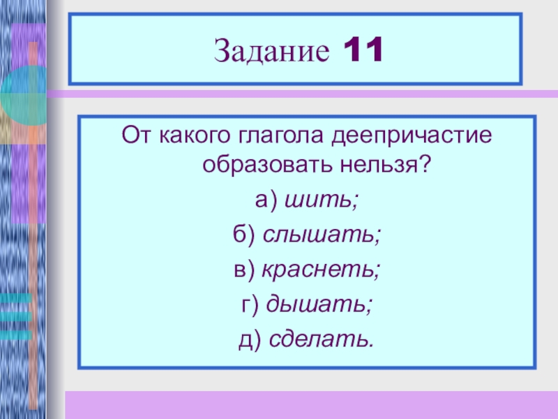 Задание 11От какого глагола деепричастие образовать нельзя?а) шить;б) слышать;в) краснеть;г) дышать;д) сделать.