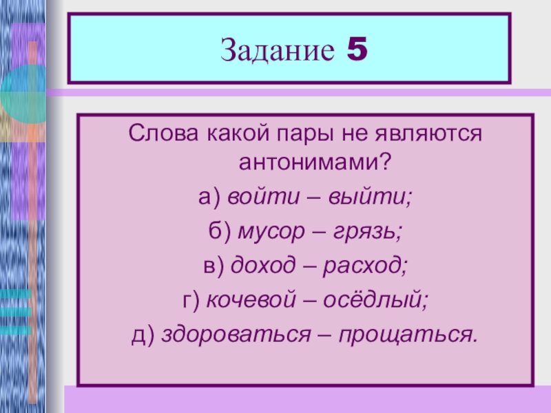 Задание 5Слова какой пары не являются антонимами?а) войти – выйти;б) мусор – грязь;в) доход – расход;г) кочевой