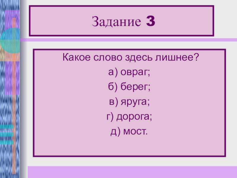 Задание 3 Какое слово здесь лишнее?а) овраг; б) берег;в) яруга;г) дорога;д) мост.