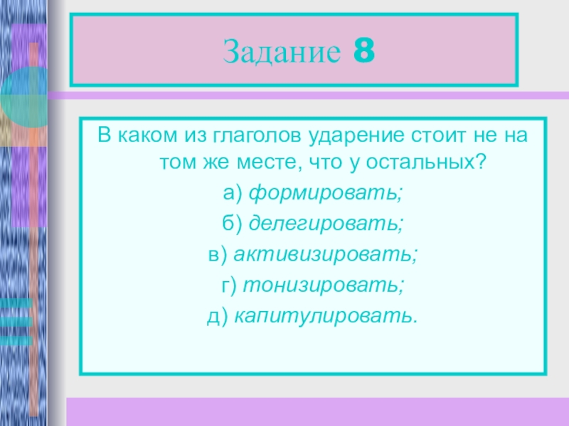 Задание 8В каком из глаголов ударение стоит не на том же месте, что у остальных?а) формировать;б) делегировать;в)