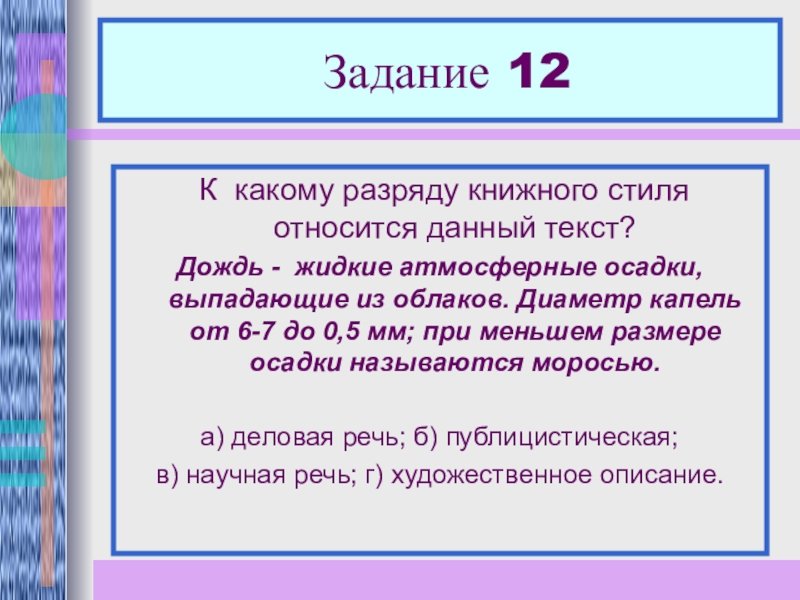 Задание 12 К какому разряду книжного стиля относится данный текст?Дождь - жидкие атмосферные осадки, выпадающие из облаков.