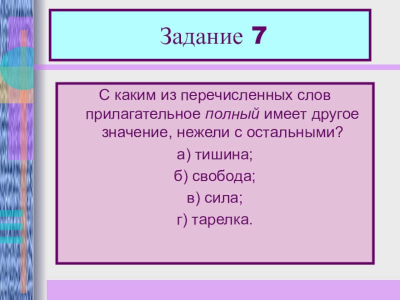 Задание 7С каким из перечисленных слов прилагательное полный имеет другое значение, нежели с остальными?а) тишина;б) свобода;в) сила;г)