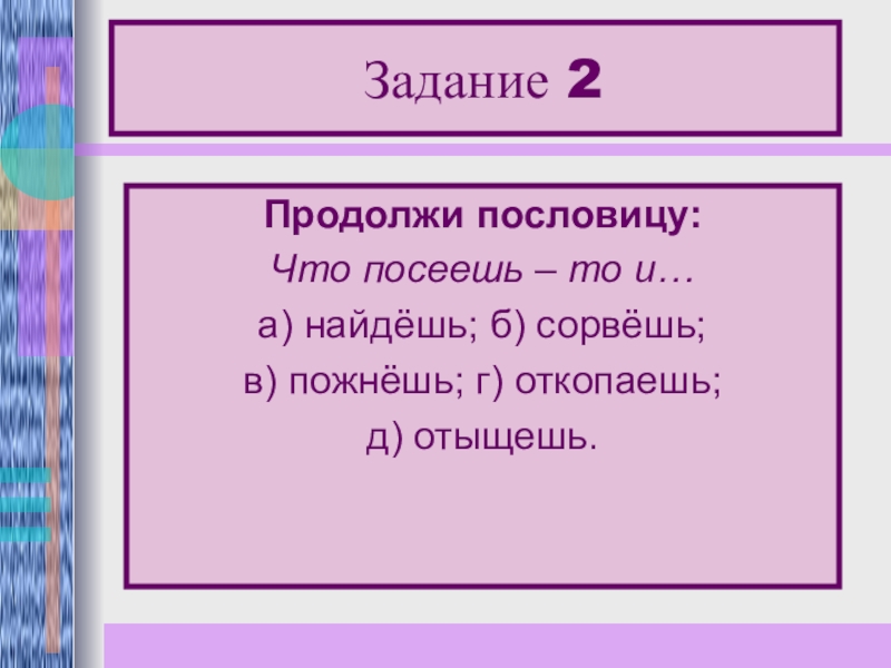 Задание 2Продолжи пословицу:Что посеешь – то и…а) найдёшь; б) сорвёшь;в) пожнёшь; г) откопаешь;д) отыщешь.