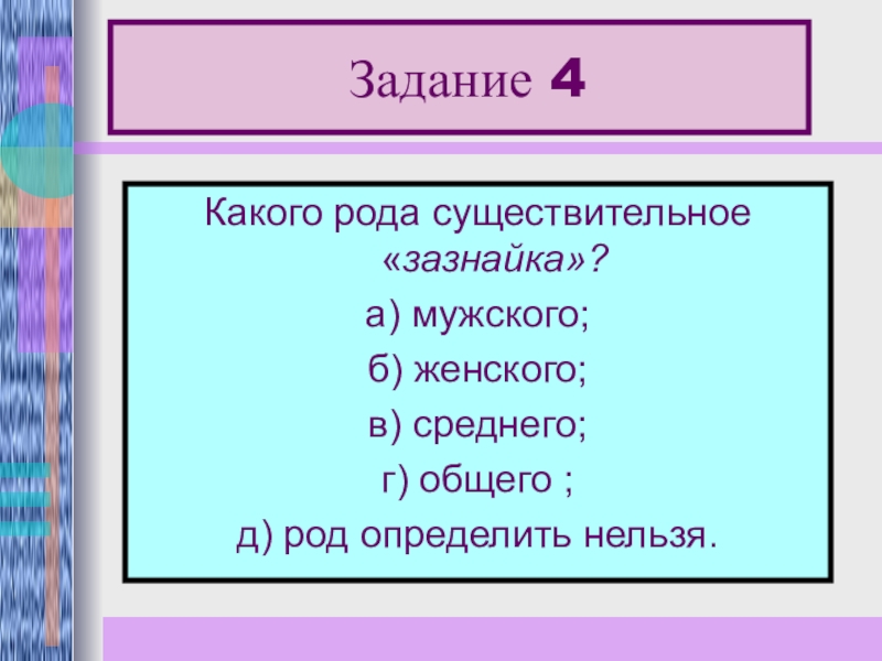 Задание 4Какого рода существительное «зазнайка»?а) мужского;б) женского;в) среднего;г) общего ;д) род определить нельзя.