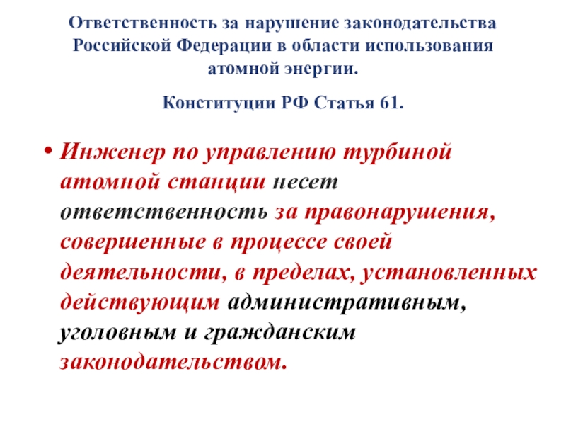 Инженер по управлению турбиной атомной станции несет ответственность за правонарушения, совершенные в процессе своей деятельности, в пределах, установленных действующим административным, уголовным и гражданским законодательством.