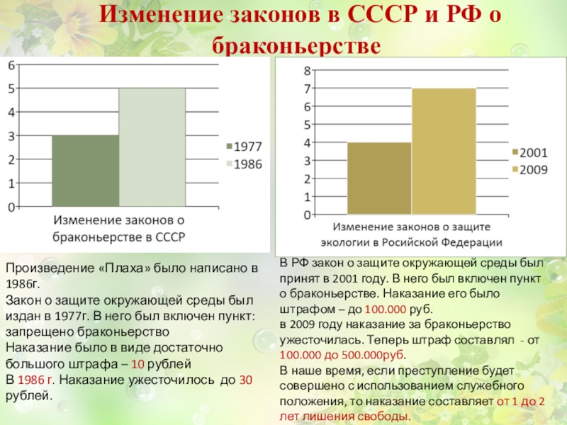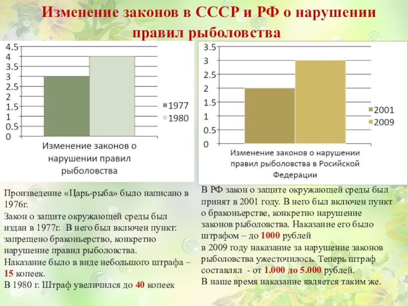 В РФ закон о защите окружающей среды был принят в 2001 году. В него был включен пункт о браконьерстве, конкретно нарушение законов рыболовства. Наказание его было штрафом – до 1000 рублей