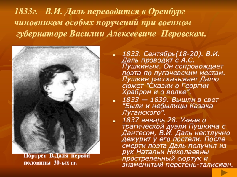 1833. Сентябрь(18-20). В.И. Даль проводит с А.С. Пушкиным. Он сопровождает поэта по пугачевским местам. Пушкин рассказывает Далю сюжет "Сказки о Георгии Храбром и о волке".