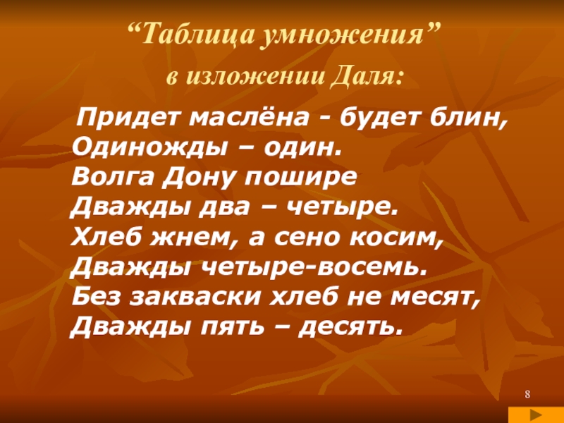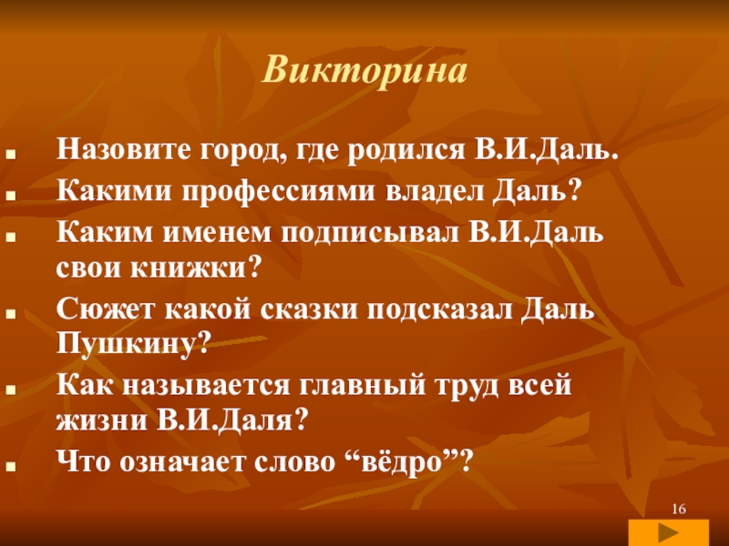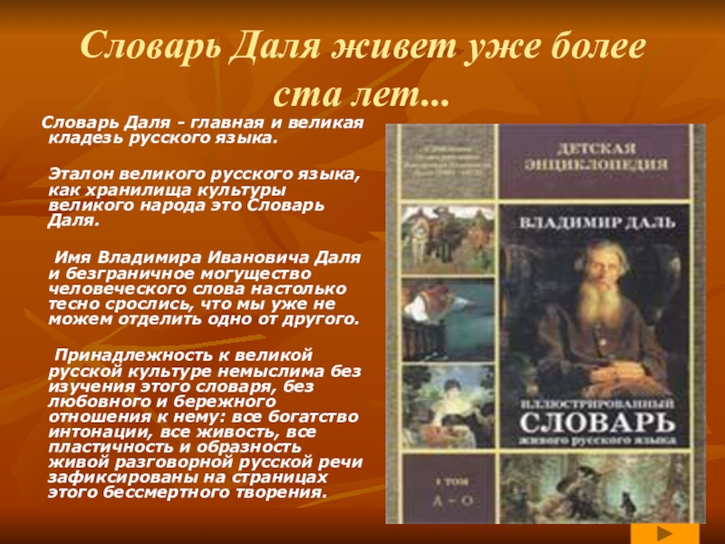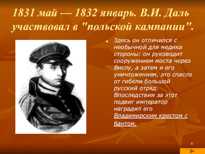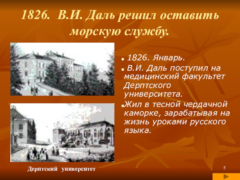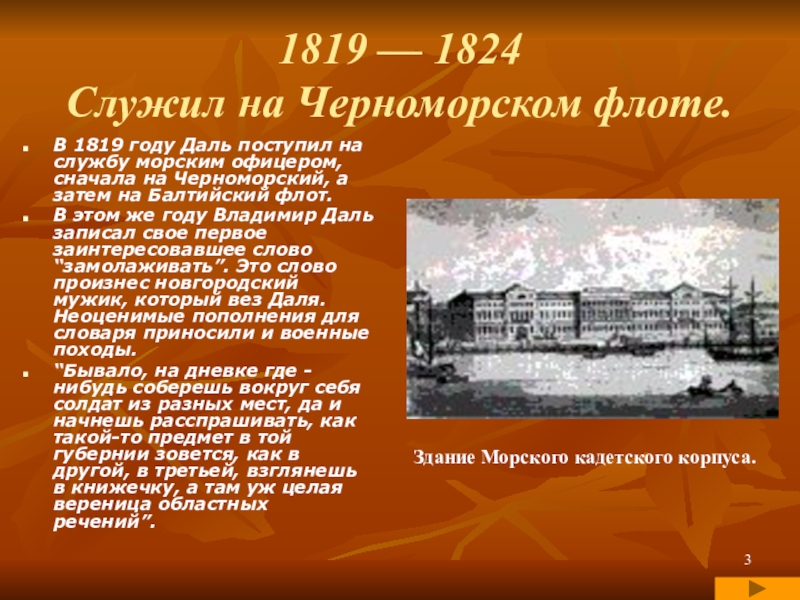 В.И.Даль учился в Морском кадетском корпусе в Петербурге. Именно здесь проявился у него интерес к русскому языку, он составил первый словарь, в который входило 34 слова кадетского жаргона.