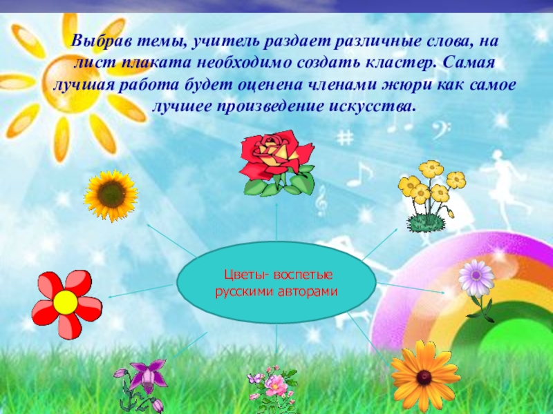 Выбрав темы, учитель раздает различные слова, на лист плаката необходимо создать кластер. Самая лучшая работа будет оценена членами жюри как самое лучшее произведение искусства.