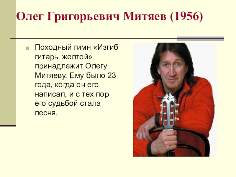 Походный гимн «Изгиб гитары желтой» принадлежит Олегу Митяеву.