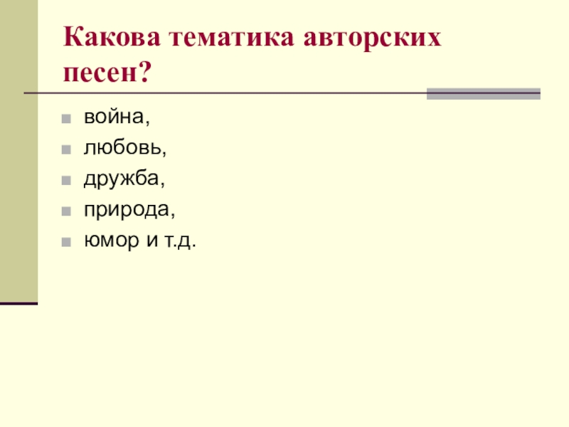 Слайд 18Какова тематика авторских песен?