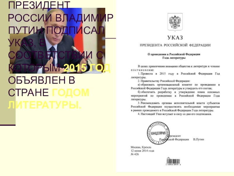 Слайд 2ПРЕЗИДЕНТ РОССИИ ВЛАДИМИР ПУТИН ПОДПИСАЛ УКАЗ, В СООТВЕТСТВИИ С КОТОРЫМ 2015