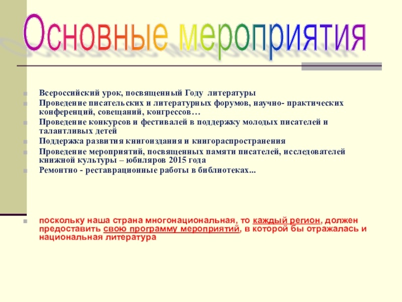 поскольку наша страна многонациональная, то каждый регион, должен предоставить свою программу мероприятий, в которой бы отражалась и национальная литература