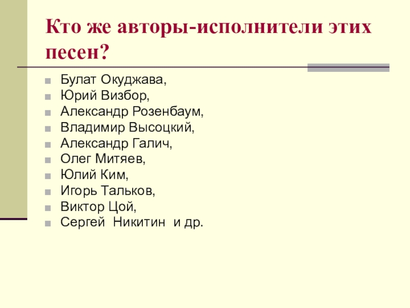 Слайд 8Кто же авторы-исполнители этих песен?