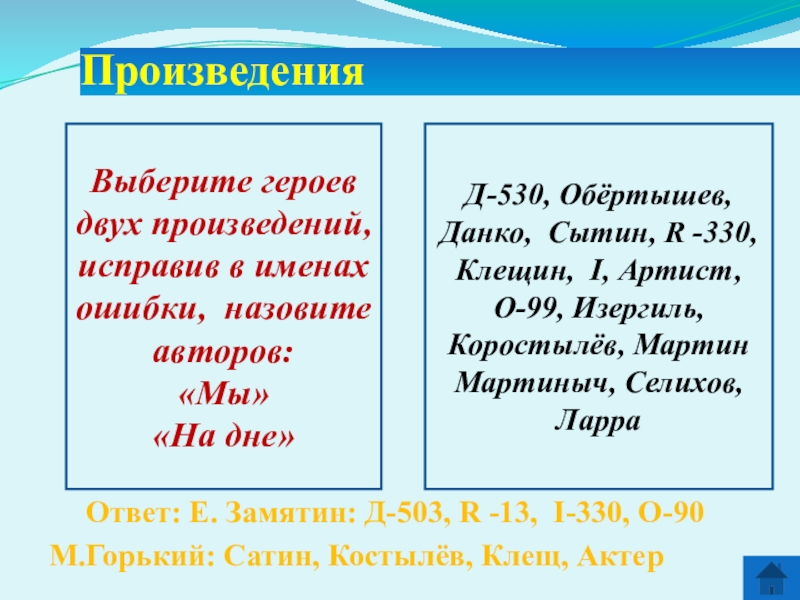 Выберите героев двух произведений, исправив в именах ошибки, назовите авторов: