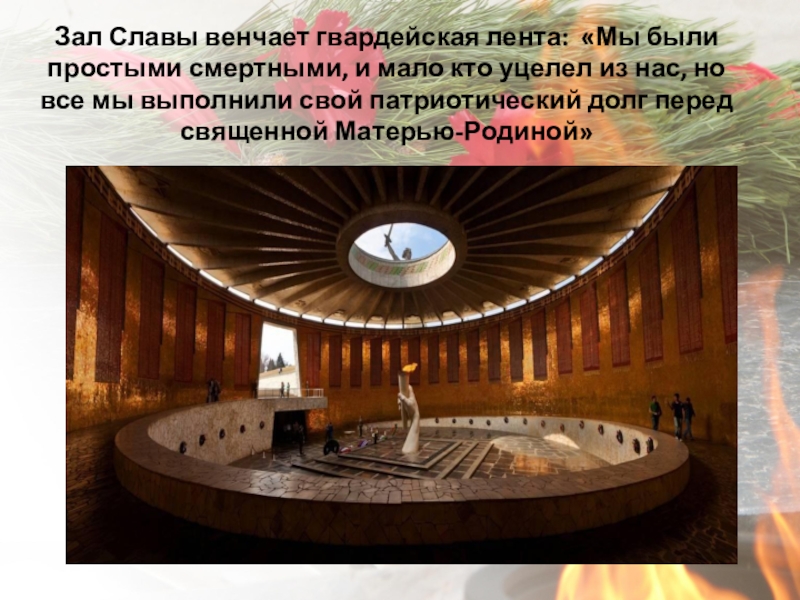 Слайд 5Зал Славы венчает гвардейская лента:  «Мы были простыми смертными, и мало