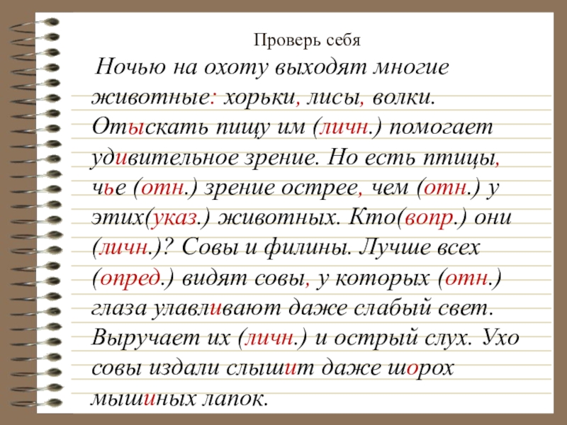 волки. Отыскать пищу им (личн.) помогает удивительное зрение. Но есть птицы, чье (отн.) зрение острее, чем (отн.) у этих(указ.) животных. Кто(вопр.) они (личн.)? Совы и филины. Лучше всех(опред.) видят совы, у которых (отн.) глаза улавливают даже слабый свет. Выручает их (личн.) и острый слух. Ухо совы издали слышит даже шорох мышиных лапок.