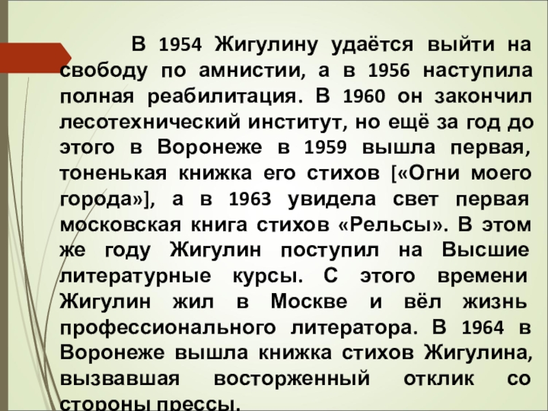 амнистии, а в 1956 наступила полная реабилитация. В 1960 он закончил лесотехнический институт, но ещё за год до этого в Воронеже в 1959 вышла первая, тоненькая книжка его стихов [«Огни моего города»], а в 1963 увидела свет первая московская книга стихов «Рельсы». В этом же году Жигулин поступил на Высшие литературные курсы. С этого времени Жигулин жил в Москве и вёл жизнь профессионального литератора. В 1964 в Воронеже вышла книжка стихов Жигулина, вызвавшая восторженный отклик со стороны прессы.