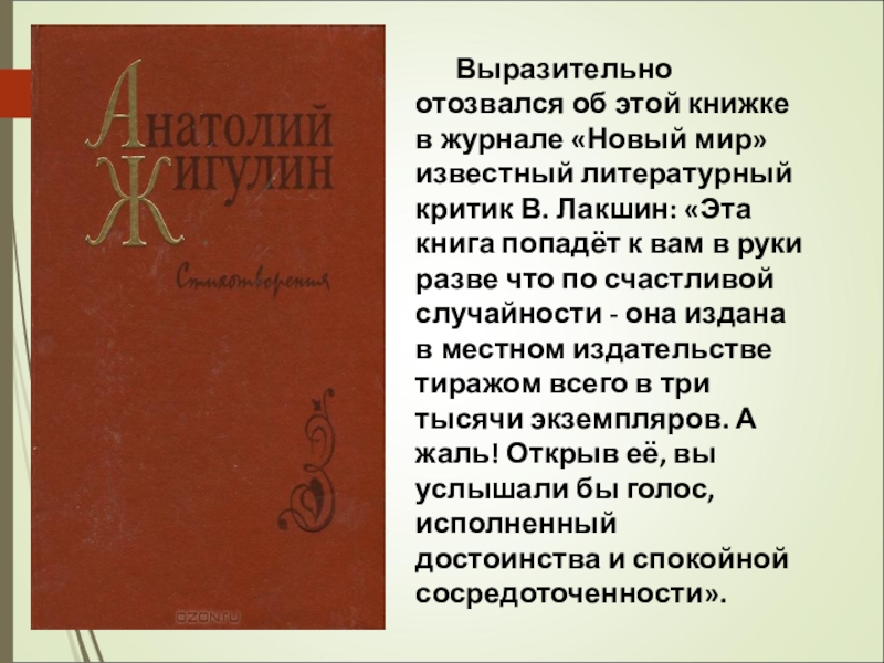 мир» известный литературный критик В. Лакшин: «Эта книга попадёт к вам в руки разве что по счастливой случайности - она издана в местном издательстве тиражом всего в три тысячи экземпляров. А жаль! Открыв её, вы услышали бы голос, исполненный достоинства и спокойной сосредоточенности».