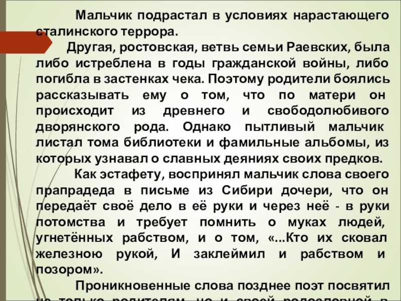 Другая, ростовская, ветвь семьи Раевских, была либо истреблена в годы гражданской войны, либо погибла в застенках чека. Поэтому родители боялись рассказывать ему о том, что по матери он происходит из древнего и свободолюбивого дворянского рода. Однако пытливый мальчик листал тома библиотеки и фамильные альбомы, из которых узнавал о славных деяниях своих предков.