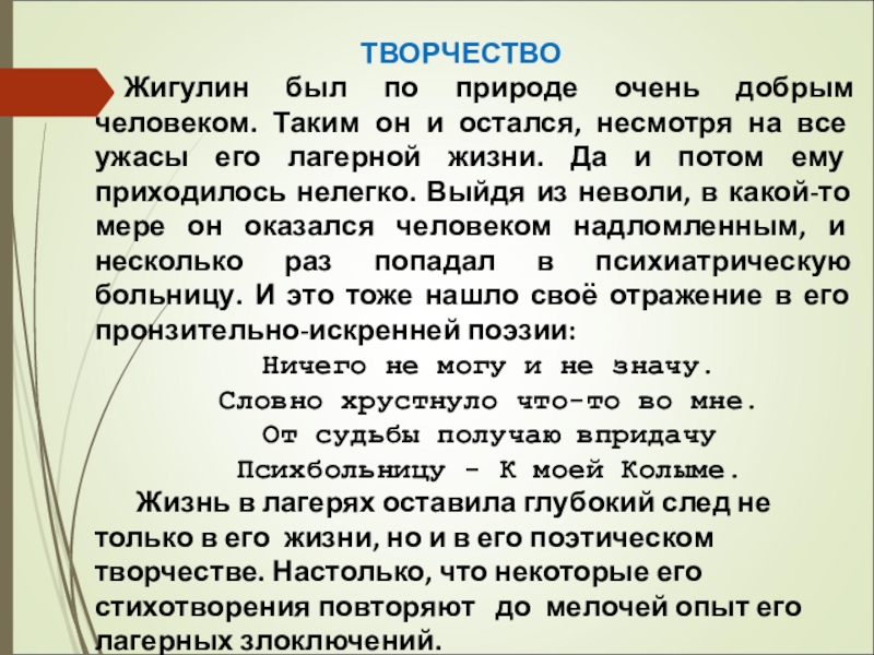 Жигулин был по природе очень добрым человеком. Таким он и остался, несмотря на все ужасы его лагерной жизни. Да и потом ему приходилось нелегко. Выйдя из неволи, в какой-то мере он оказался человеком надломленным, и несколько раз попадал в психиатрическую больницу. И это тоже нашло своё отражение в его пронзительно-искренней поэзии: