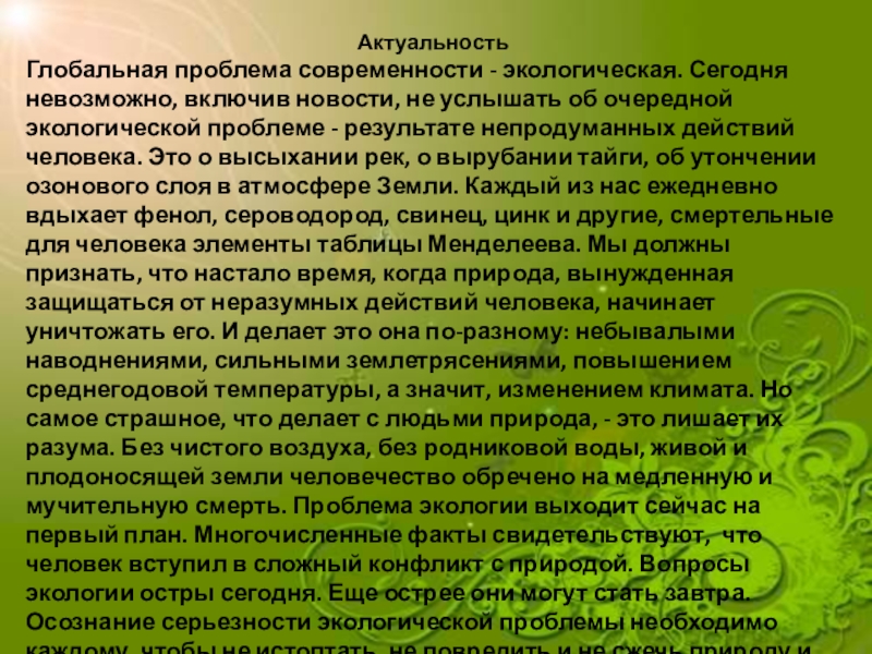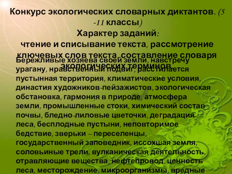Бережливые хозяева своей земли, навстречу урагану, нравственный подвиг, расстилается пустынная территория, климатические условия, династия художников-пейзажистов, экологическая обстановка, гармония в природе, атмосфера земли, промышленные стоки, химический состав почвы, бледно-лиловые цветочки, деградация леса, бесплодные пустыни, неповторимое бедствие, зверьки – переселенцы, государственный заповедник, иссохшая земля, соловьиные трели, вулканическая деятельность, отравляющие вещества, нефтепровод, ценность леса, месторождение, микроорганизмы, вредные примеси, канцерогенные вещества.